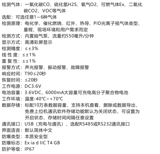 防護(hù)級(jí)別IP67,本安電路設(shè)計(jì),防爆、防震,抗靜電,抗電磁干擾:·采用國(guó)際著名品牌氣體傳感器,高靈敏度及穩(wěn)定性好;可擴(kuò)展到6種氣體同時(shí)檢測(cè);